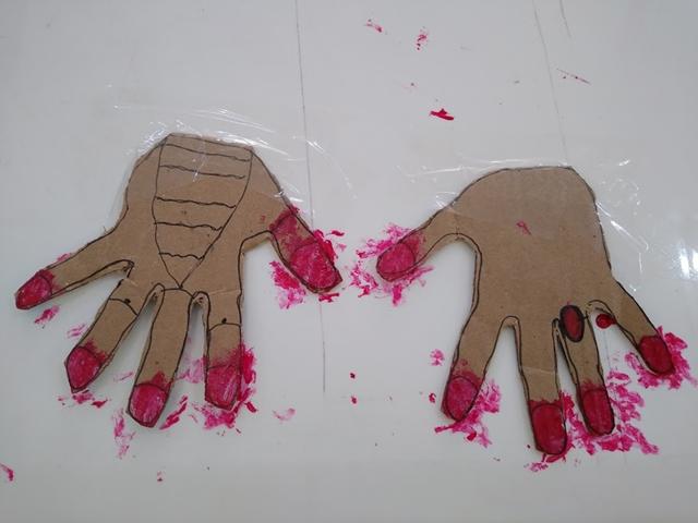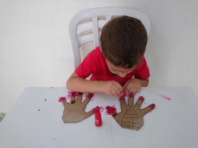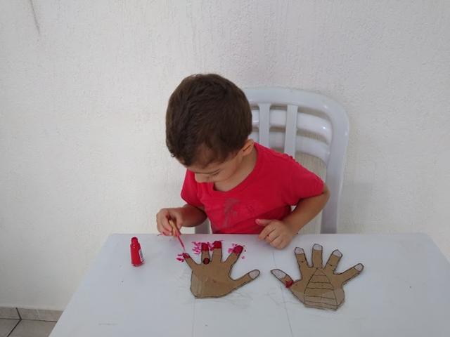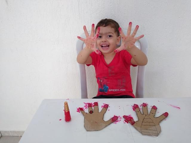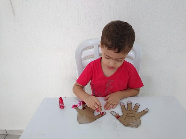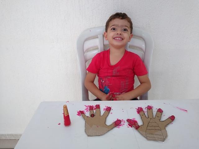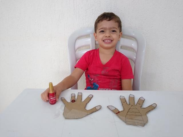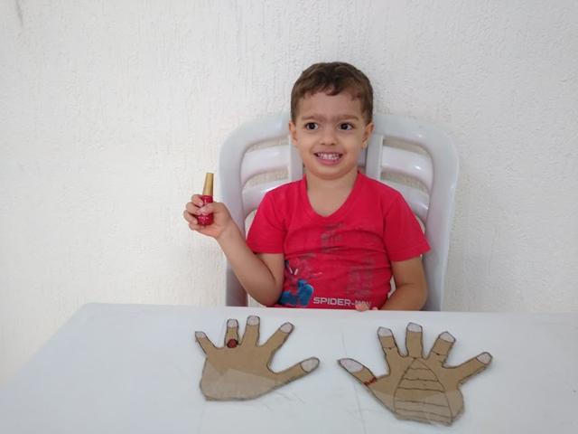 Atividade mega divertida através do brincar! VAMOS PINTAR AS UNHAS? Eu desenhei da minha mão no papelão e o Davi Antonios pintou usando o esmalte “vermelho”. Estimula o movimento de pinça, desenvolve noções de percepção lógica e espacial. Para pintar as unhas, é necessário perceber a demarcação do limite (muito, pouco, dentro, fora). “Até onde eu posso ir?” O brincar é natural. Sem “grilos”. O preconceito está na cabeça do adulto.