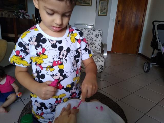 Tento arranjar tempo para satisfazer as minhas necessidades. Por isso, sempre que posso, carrego meu Davi Antonios comigo para ir ao salão de beleza. Ao me ver pintar as unhas, começou a pedir para fazer o mesmo.