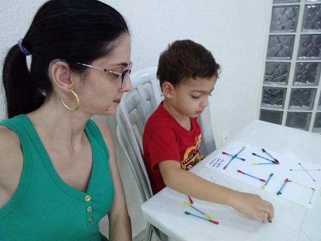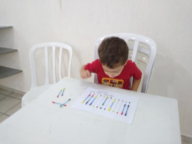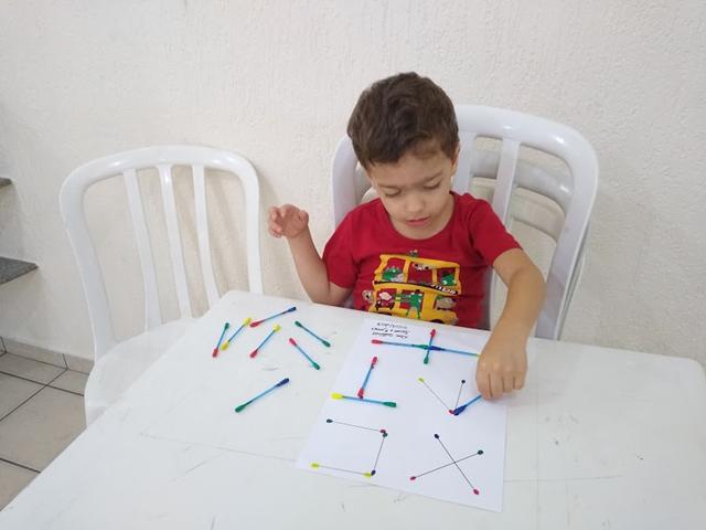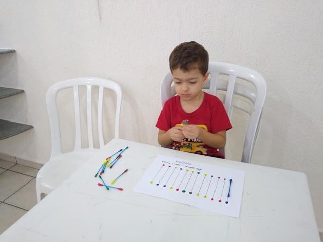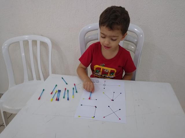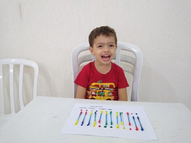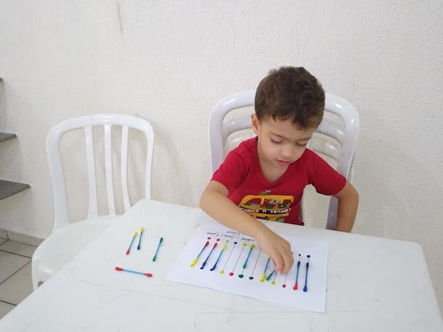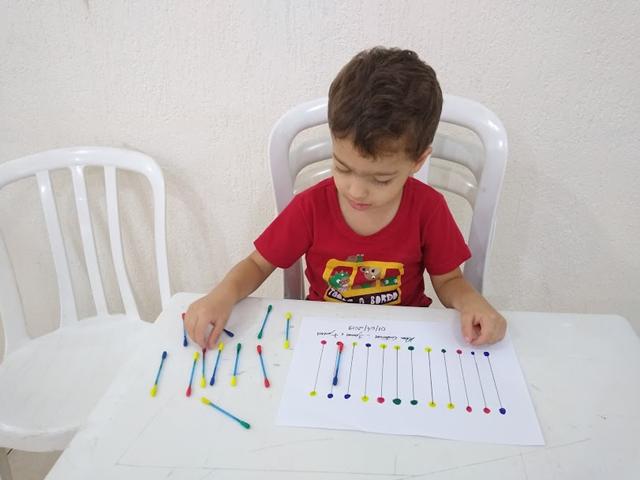 Hoje rolou uma atividade simples e muito criativa! Cotonete, tinta e papel! É uma excelente atividade que desenvolve a atenção, a concentração, a percepção de cores, memória visual, o raciocínio lógico e a paciência.