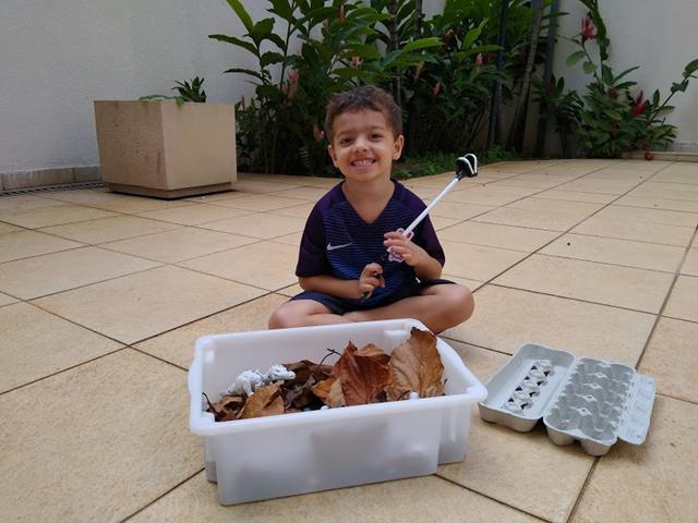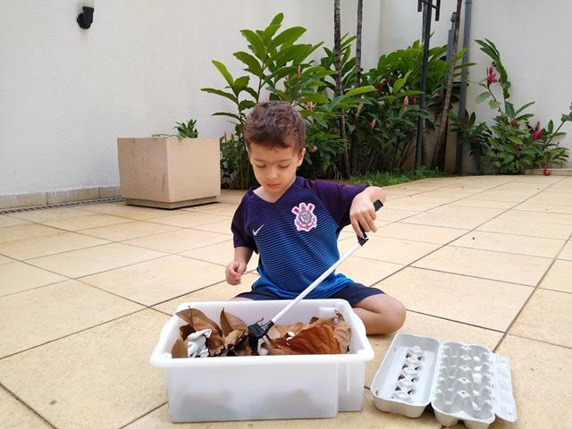 Material utilizado: folhagens, pompom, dinossauro de plástico, cartela de ovo e boca maluca (pegador).