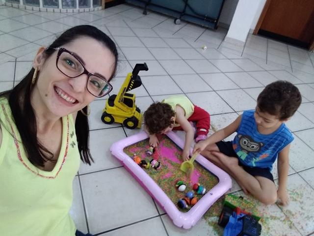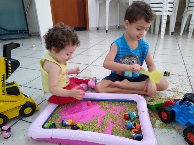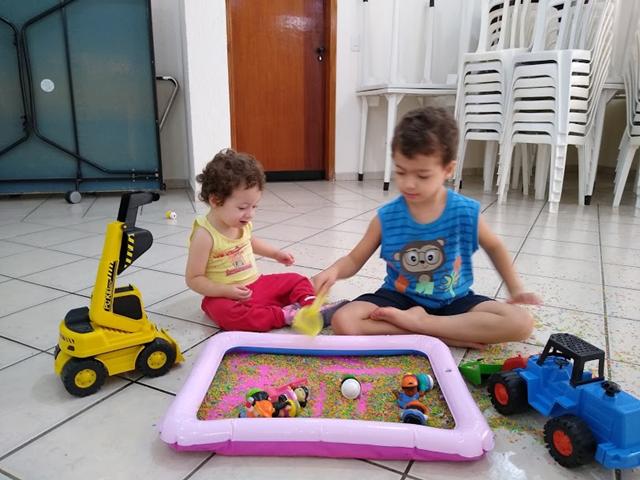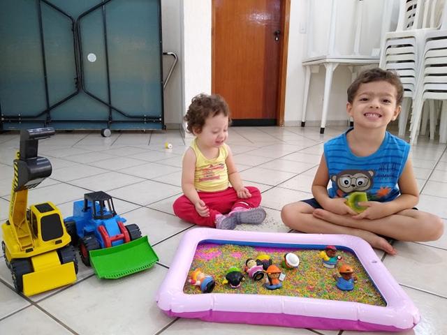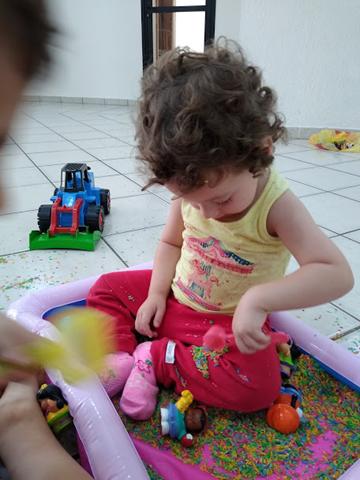 Uma atividade sensorial montessoriana linda e que rende tantos momentos de criação. Eu despejei o arroz na caixa, coloquei os brinquedos como duas escavadoras, uma pá, um medidor de leite e os bonequinhos pequenos, como se fosse uma caixa de areia e chamamos a Helena para brincar. É uma delícia observar as descobertas! Tem o momento de simplesmente tocar no arroz. Tem a hora em que o desafio é tentar transportar o arroz de um recipiente para o outro. Lógico que parte da atividade é jogar o arroz para o lado de fora. E tudo bem! Apenas recomendo fazer numa superfície fácil de varrer depois, como o chão do lazer.
