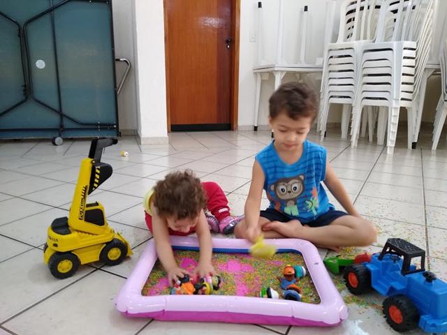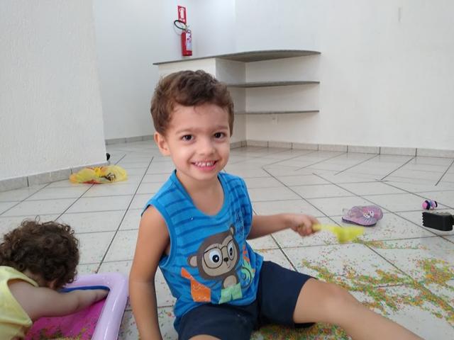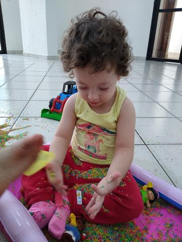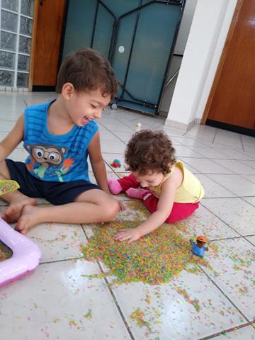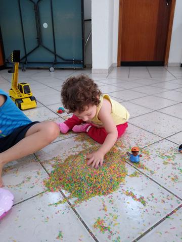 Você pensa que acabou? Nããão! Quando eu estava varrendo tudo, acabou formando um monte de arroz no chão e a Helena ficou toda interessada. Resultado, voltou para a área de brincadeira e começou a mexer em tudo de novo! Rsrsrs