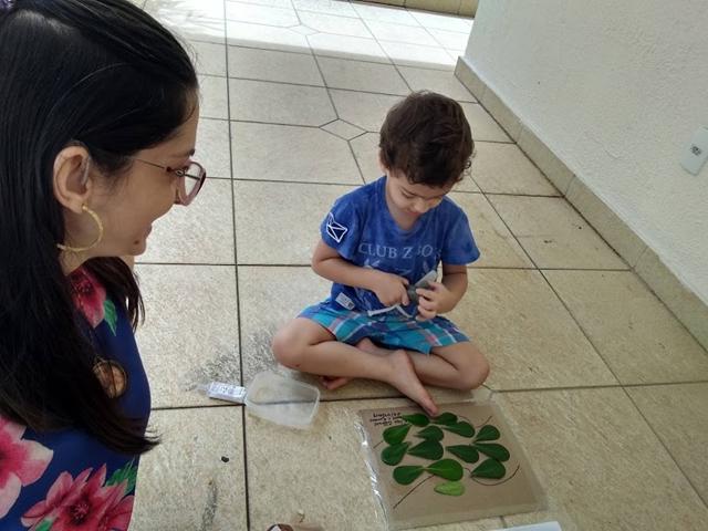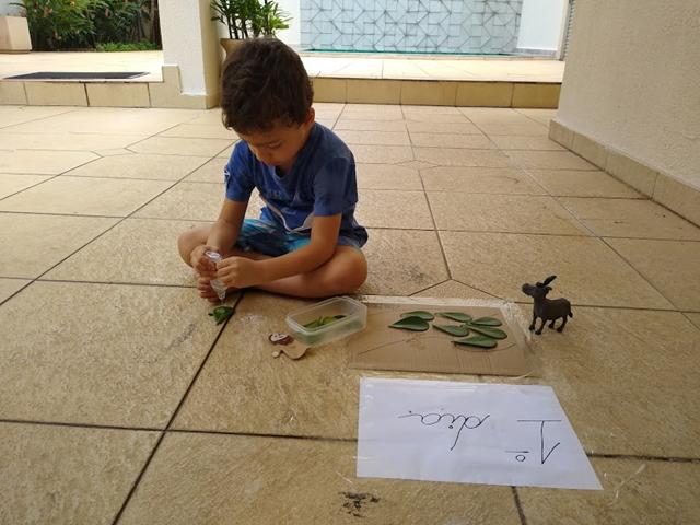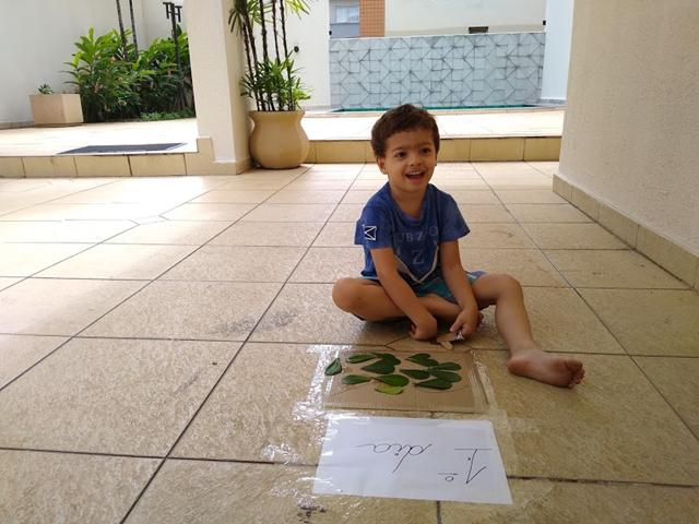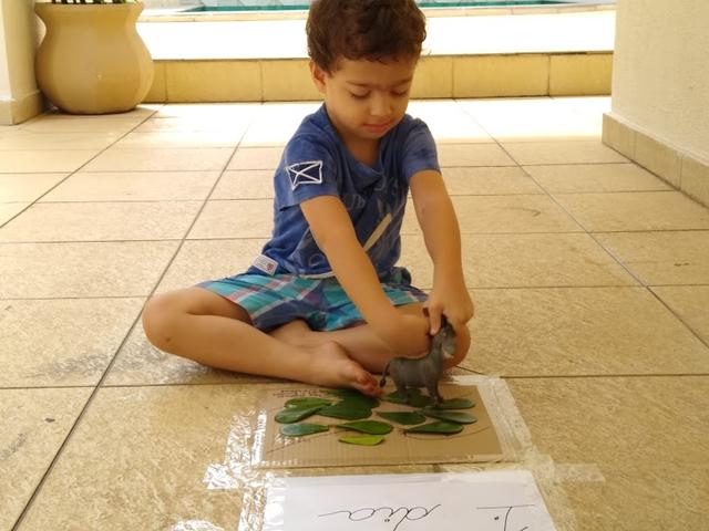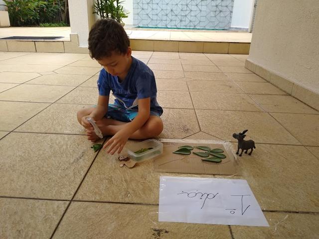 1º dia: A nossa atividade com o RAMO DE FOLHAS (representando a entrada triunfal de Jesus em Jerusalém – Mateus 21: 7-9). Eu separei várias folhinhas e fiz um caminho no qual ele tinha que colar as folhas, representando os ramos que as pessoas jogavam no chão enquanto Jesus entrava em Jerusalém.