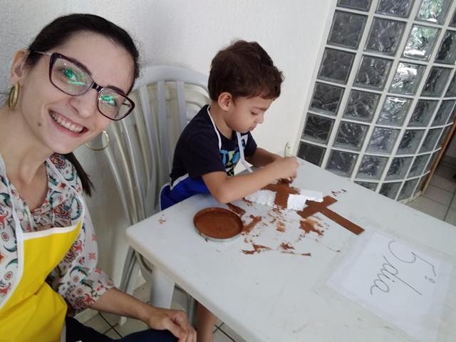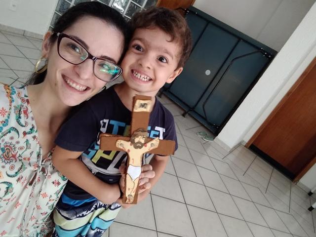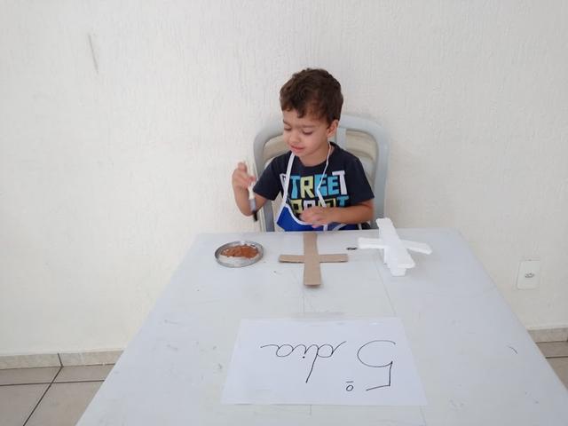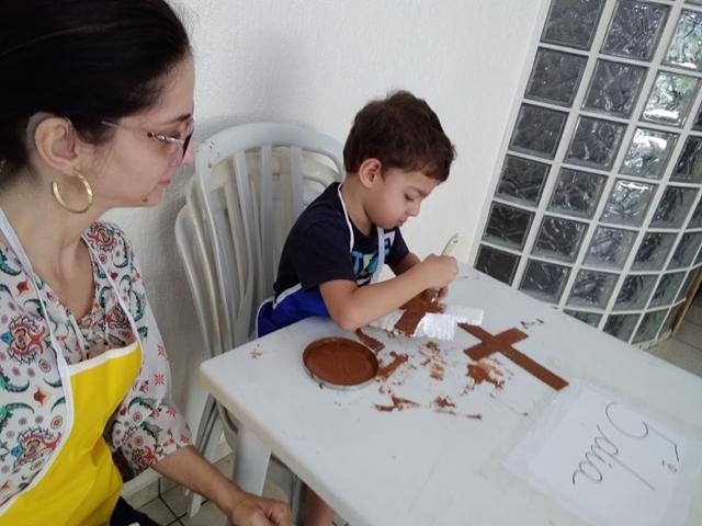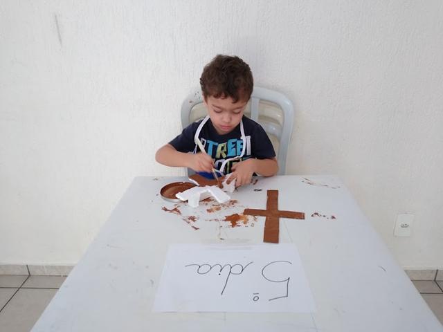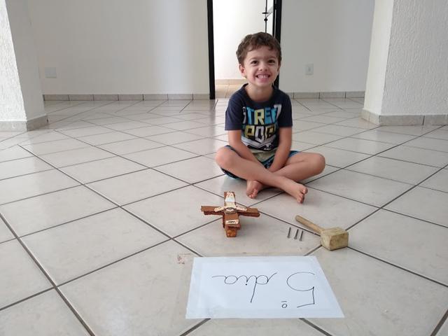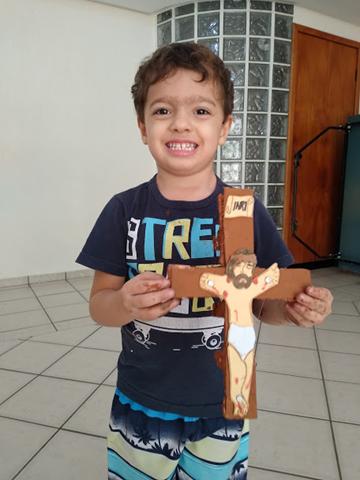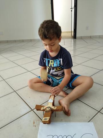 Materiais: Papelão, caixa de isopor, Papel EVA, papel colorido, canetinha, pregos, martelo, tinta guache marrom e a bíblia. Eu desenhei o corpo de Jesus com papel EVA, utilizei canetinha e recortei o papel colorido para a coroa de Jesus. Davi Antonios estava pintando a cruz (papelão/caixa de isopor) com a tinta guache marrom e me perguntou: “Mamãe, como foi o Jesus morto?!”.