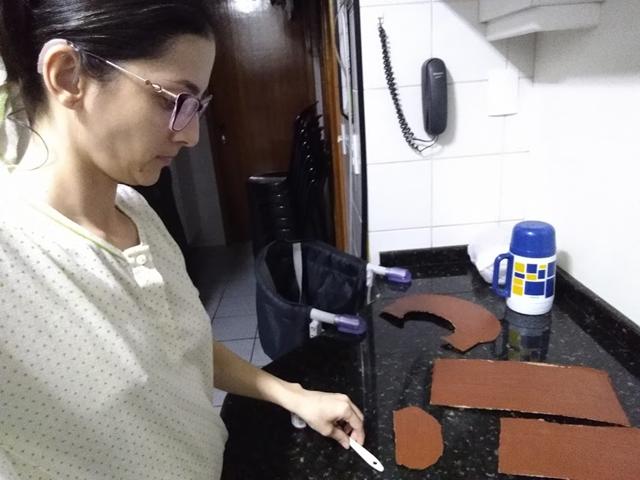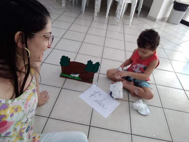 Peguei um copo descartável e pintei a cor azul com tinta guache para fazer “de céu” e o Davi Antonios tinha que passar cola e colar algodões brancos.