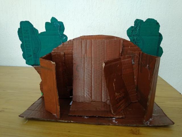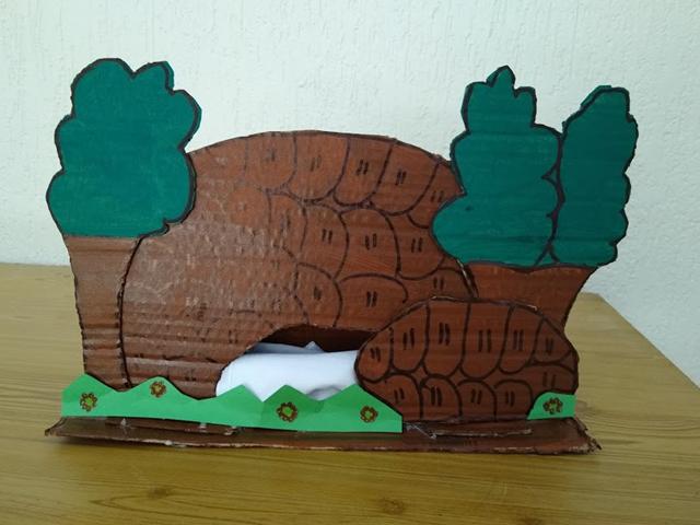 Materiais: Caixa de papelão, tinta guache, papel colorido, canetinha, corpo descartável, barbante, cola e algodão. Usei uma caixa de papelão para o túmulo, o tronco e a copa das árvores com tinta guache. Recortei o papel colorido para fazer as gramas e desenhei as flores com canetinha. Peguei um tecido branco (pano) e coloquei dentro do túmulo vazio.