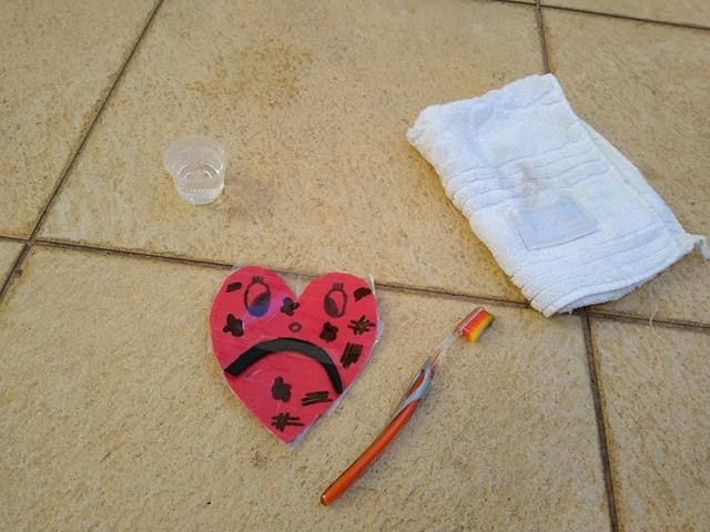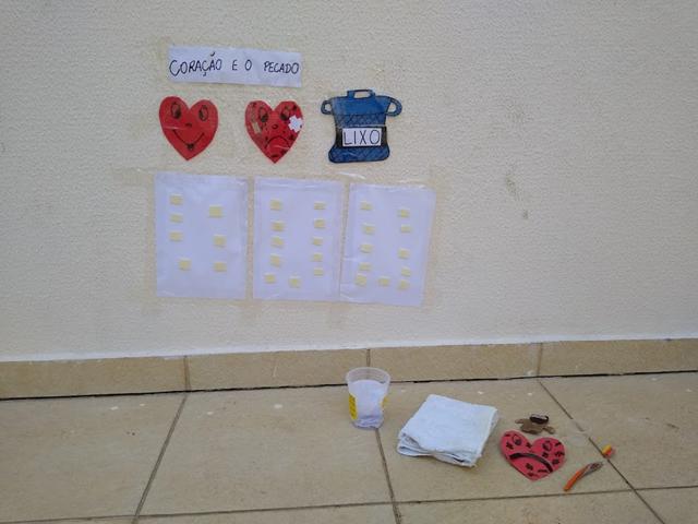 Filho, a mamãe vai ensinar para você sobre CORAÇÃO E O PECADO. Materiais: papel EVA, canetinha, fita durex, Jesus de feltro, escova de dente, água, toalha, fita dupla face e bandeja.