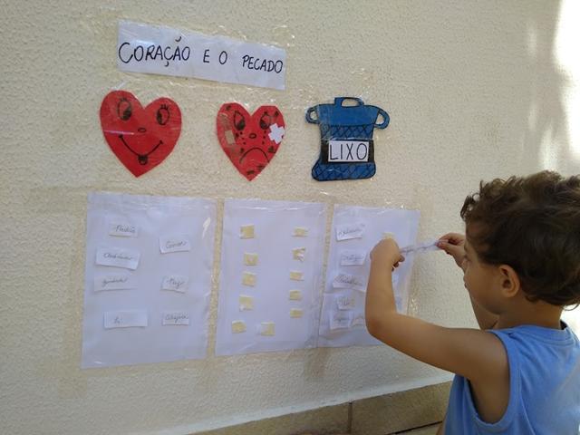 Dentro deste coração há muitas coisas ruins, vocês gostariam de saber o que há dentro dele? Desobediência, brigar amiguinho, tristeza, maldade, falar palavrão, ódio, desamor, mentira, preguiça, inveja e fofoca.