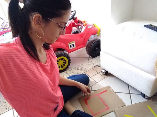 Usando papelão, fita adesiva colorida e canetinha preta, é possível criar lindos números. A mamãe fez o corte da fita adesiva colorida em número de 6, 7, 8, 9 e 10 no papelão. Depois, fez o pontinho da canetinha preta na fita adesiva colorida.