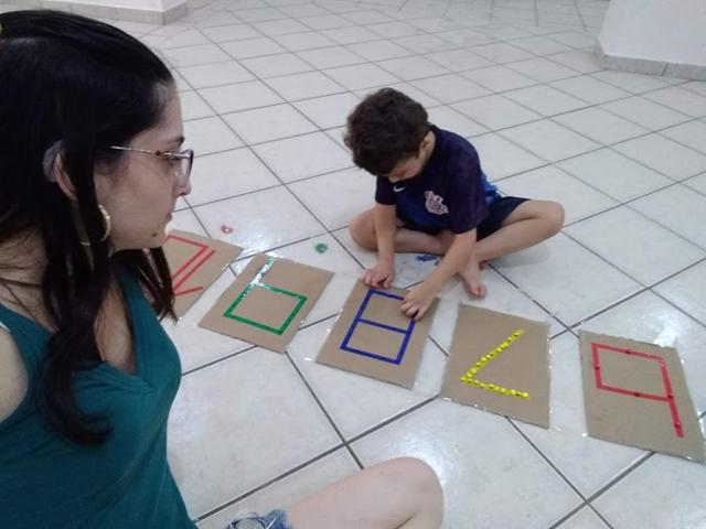 O objetivo da atividade é colocar os percevejos no pontinho da canetinha preta sobre números no papelão da cor correspondente.