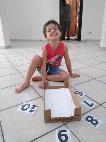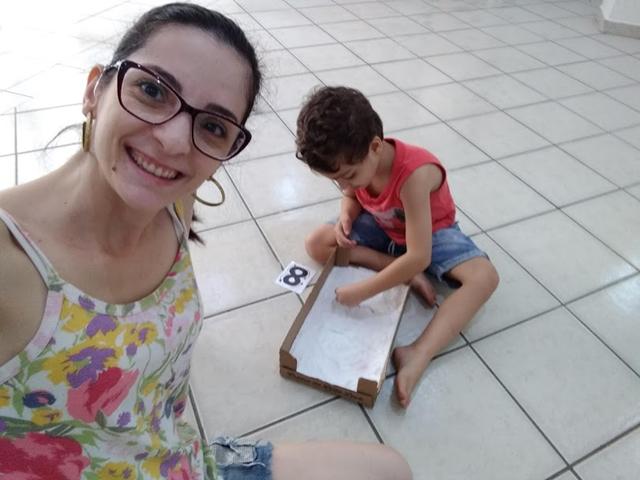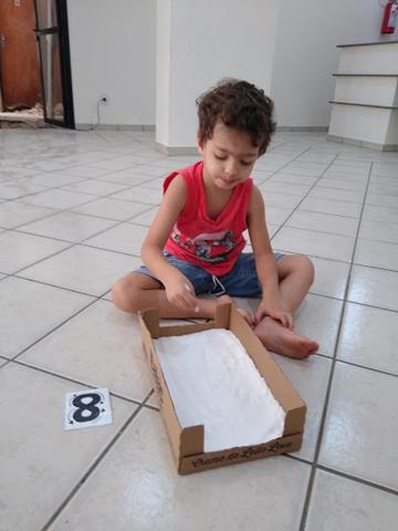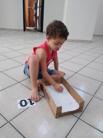 O objetivo da atividade é desenhar os números em cartões de 6, 7, 8, 9 e 10 e reproduzir com a utilização do cotonete em uma caixinha de papelão com sal.