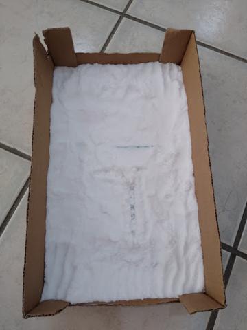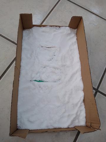 Materiais: Caixinha de papelão, papel EVA, cartões, sal e cotonete.