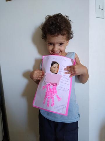 Um jeito fofo é usar as mãos dos pequenos. A mão carimbada no papel virou um lindo vestido de uma MÃE. Não ficou demais!