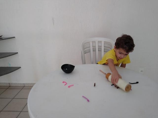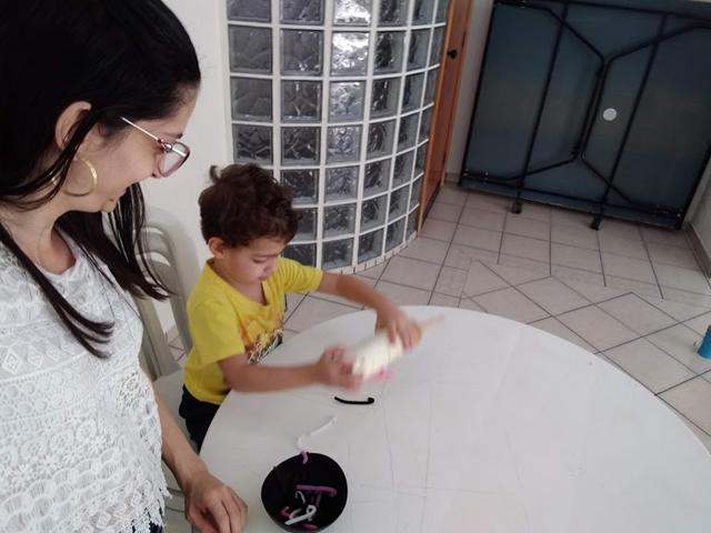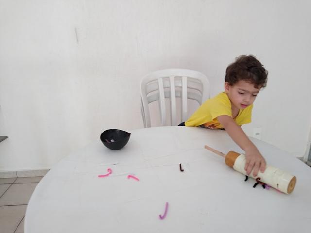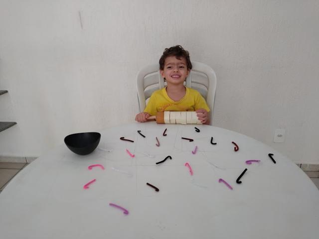 Davi Antonios imediatamente entendeu o que eu estava pedindo a ele: "Filho, pegue a minhoca cinza; pegue a minhoca roxo,..." e ele começou a pegar todos as minhocas coloridas (rosa, roxo, marrom, branco, preto, bege e cinza). Ele então esvaziou a tigela sobre a mesa, espalhou as minhocas e começou a atividade novamente.