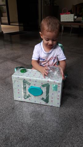 Reciclar papelão e ainda fazer uma criança feliz é bom demais, né? Outra ideia interessante foi a CÂMERA FOTOGRÁFICA feita com caixa de papelão, tampa de suco, tampa de lenço umedecido Pampers Baby e garrafa de refrigerante. Parece fácil de fazer e é uma graça.