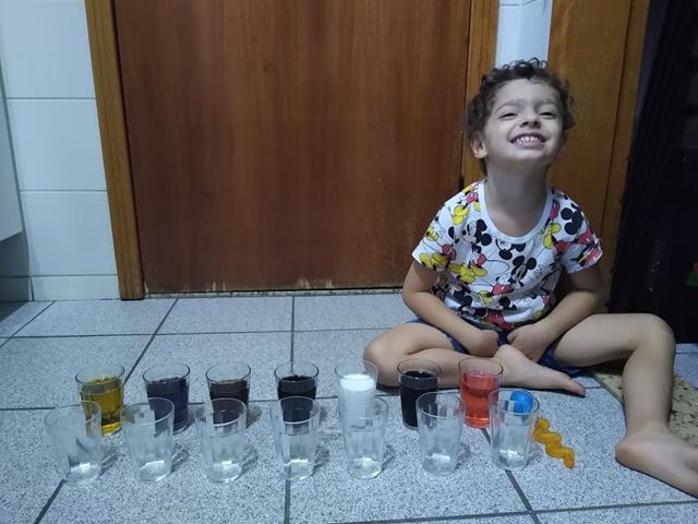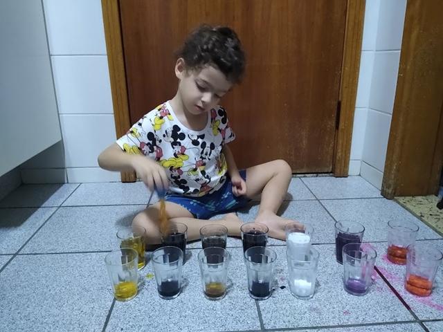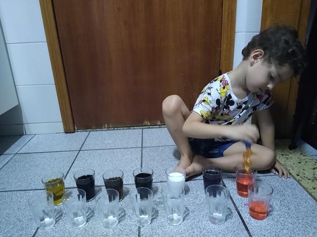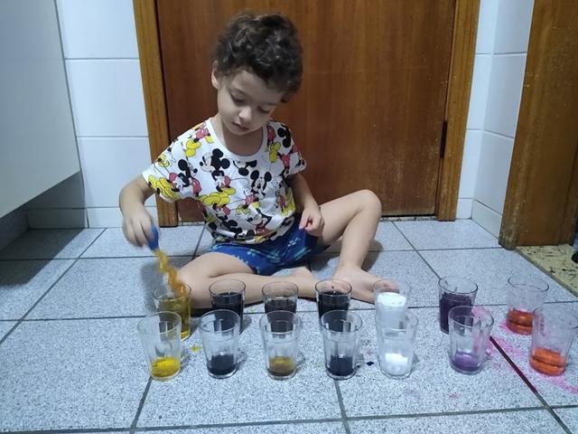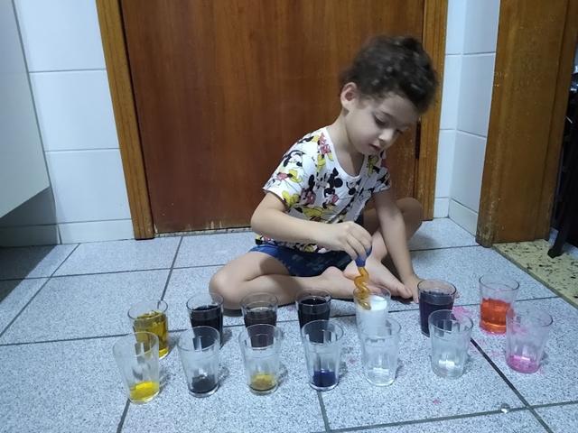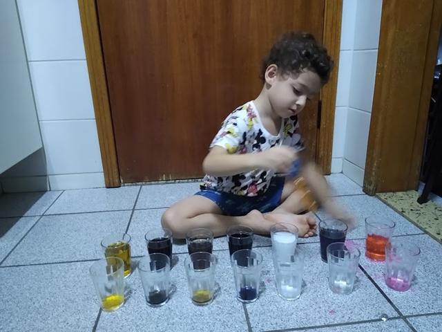 Vamos PRODUZIR as CORES (ROSA, ROXO, MARROM, BRANCO, PRETO, BEGE E CINZA) , enquanto desenvolvemos HABILIDADES motoras? Copo de vidro, corante alimentício, água, pinça conta-gotas e muita empolgação. Davi Antonios curtiu bastante. #maeemdia #brincarjunto #tempojunto #maternidadereal #maternidadeativaeconsciente #educandocomamor #DaviAntonioscom3anose9meses