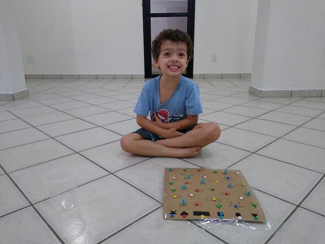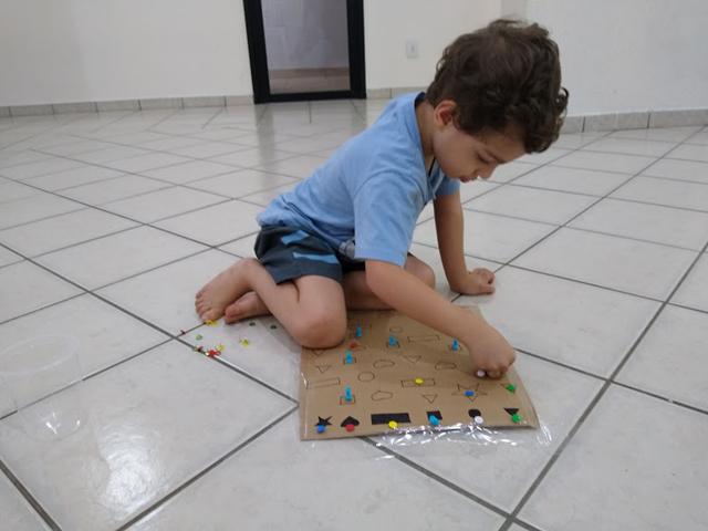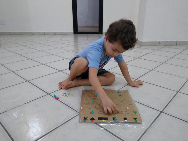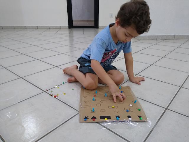 Percepção visual com as formas geométricas e cores. Usamos os percevejos coloridos, alfinetes de sinalização, papelão e canetinha preta. Davi gostou muito. #maeemdia #brincarjunto #tempojunto #maternidadereal #maternidadeativaeconsciente #educandocomamor #DaviAntonioscom3anose9meses