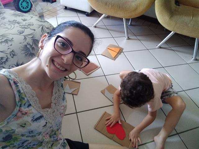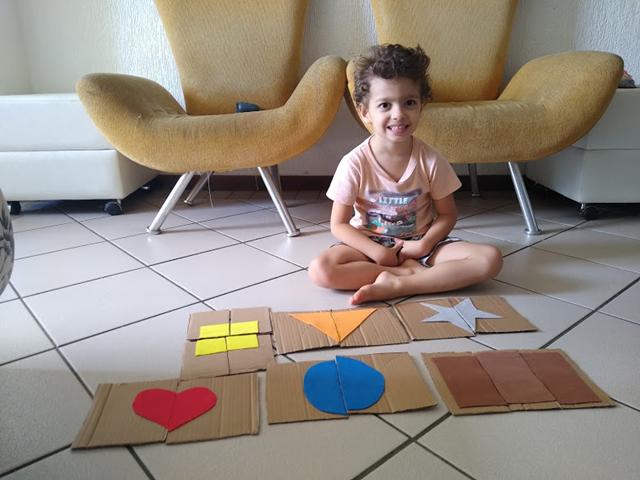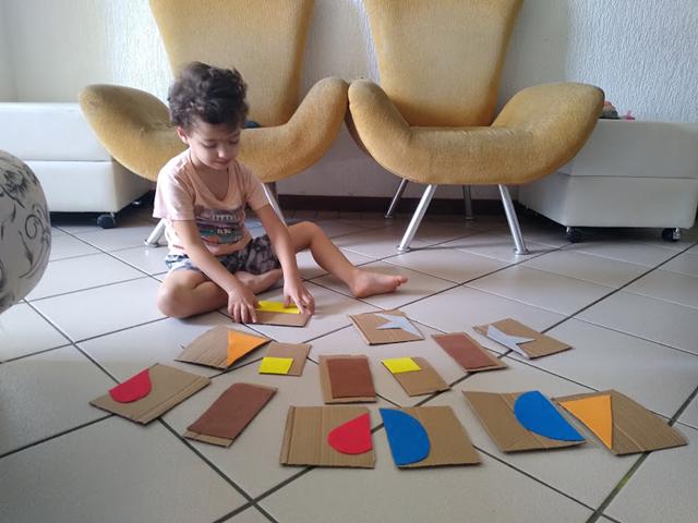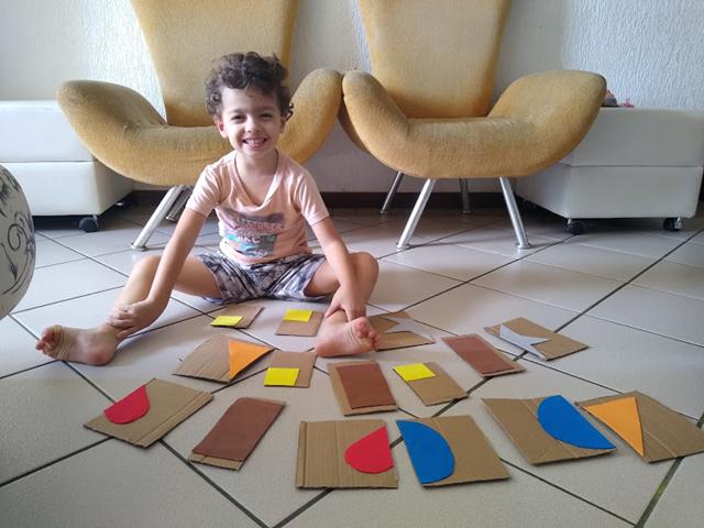 Após a atividade, eu perguntei para o Davi Antonios: "Filho, mostre para a mamãe cadê a forma geométrica quadrado?". Ele foi mostrando.