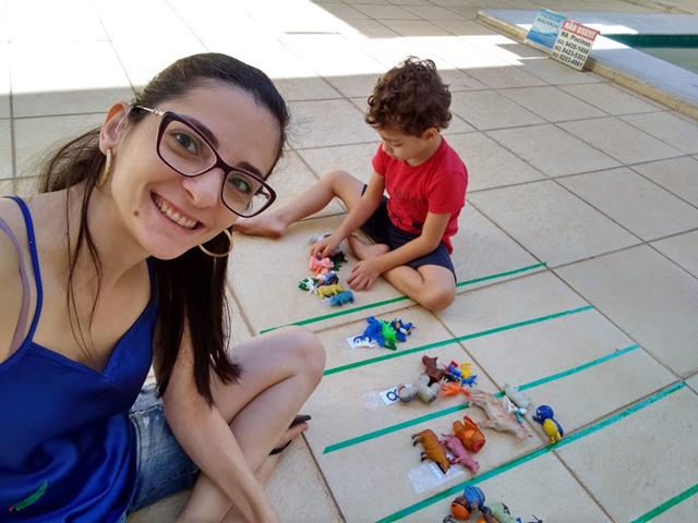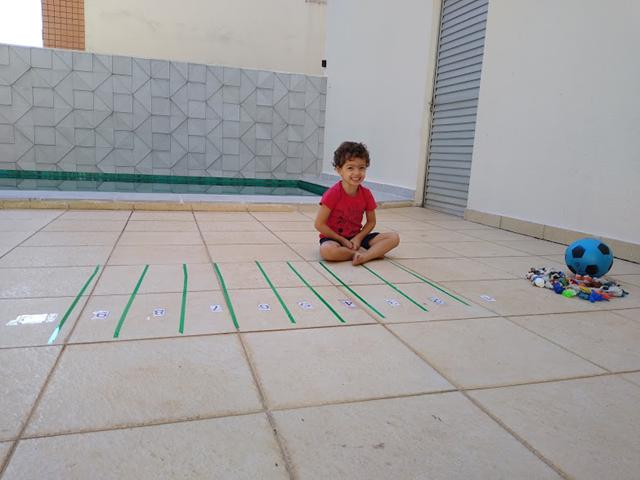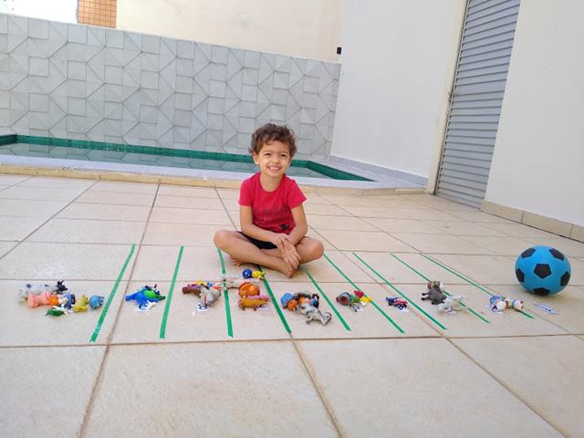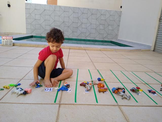 Nesta atividade, coloquei os números em cada espaço no chão, passei a fita adesiva colorida e espalhei os brinquedinhos para o Davi Antonios buscar os brinquedinhos e tentar colocar a quantidade correta dos mesmos de acordo com o algarismo.