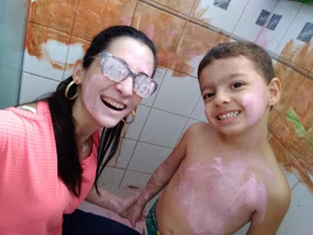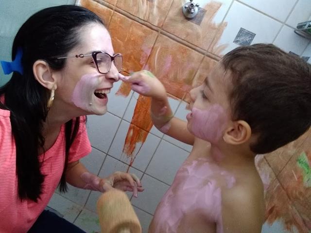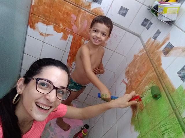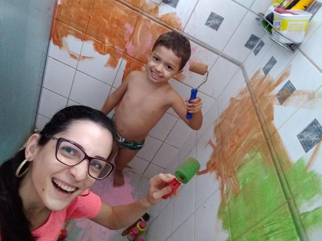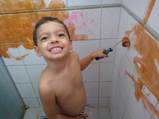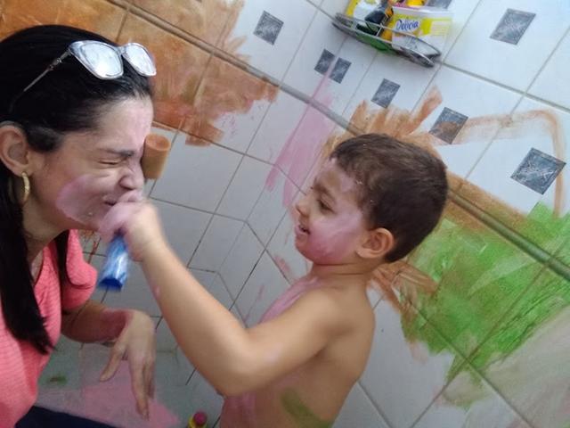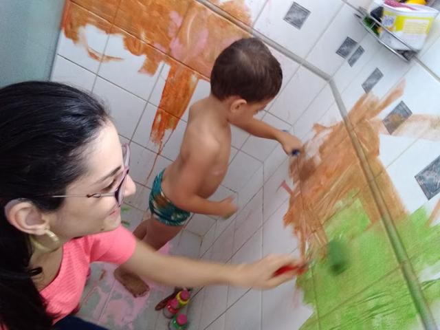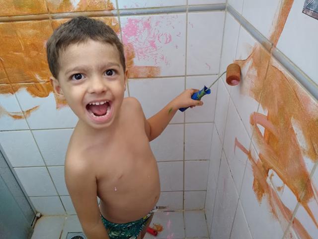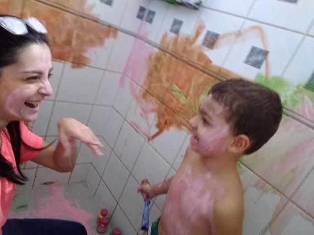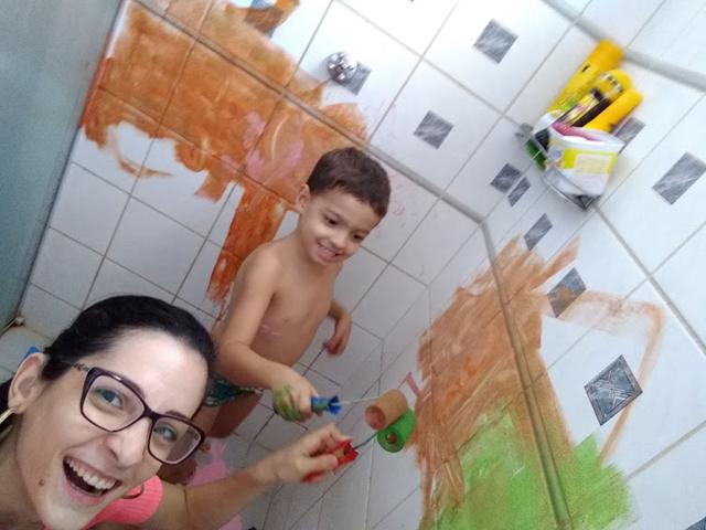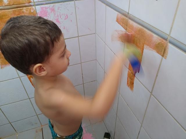 Olhando assim não parece que estamos pintando o azulejo do banheiro :) Sim! Sou dessas invento umas loucuras, mas que para meu filho são as coisas mais legais que fazemos juntos!