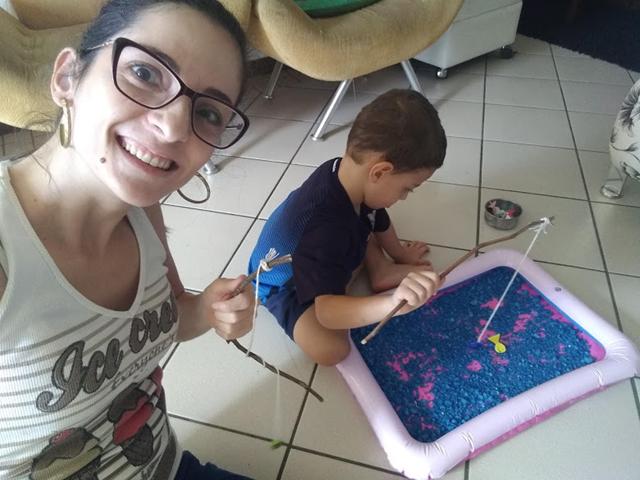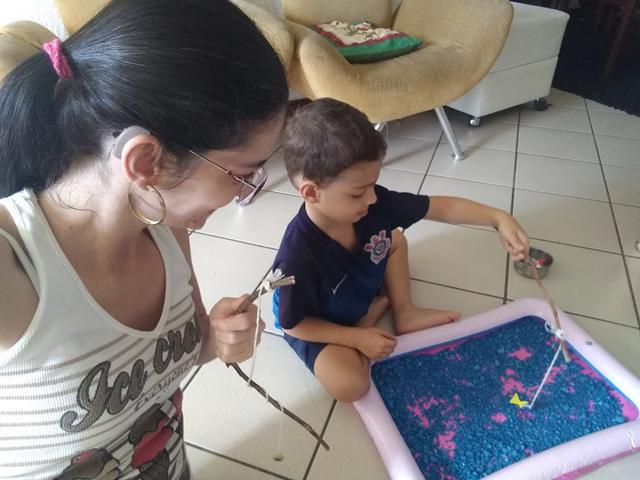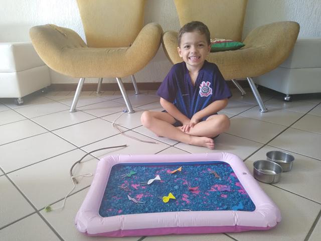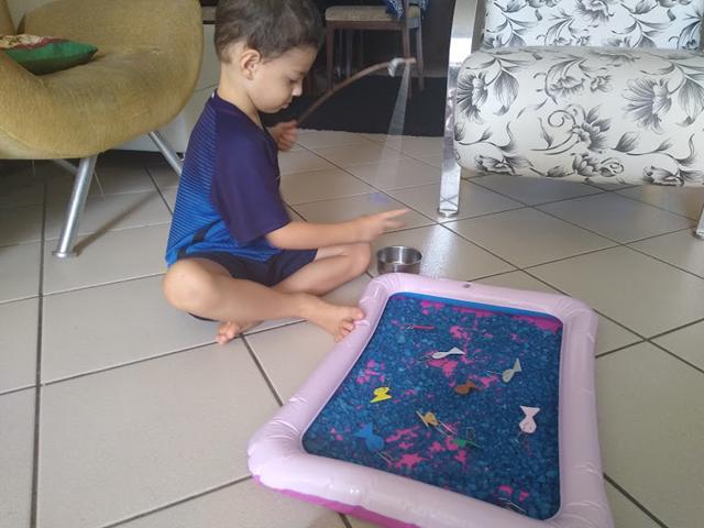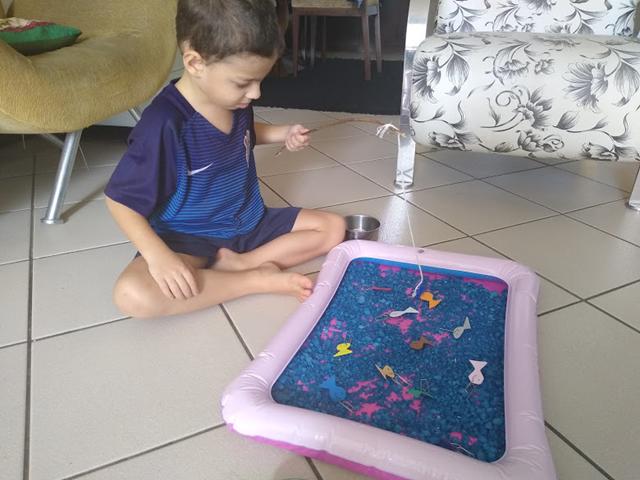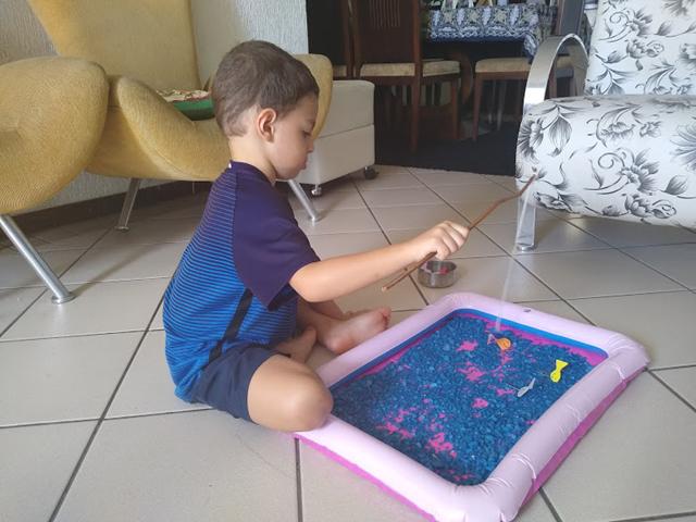 Uma maneira gostosa de aprender é brincando e contando quantos peixinhos conseguiu pegar. Ele brinca e aprende feliz.