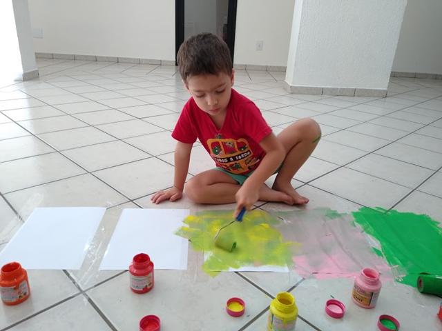 Para esta atividade usamos: papel A4, giz de cera branco, tinta guache e rolo de espuma.