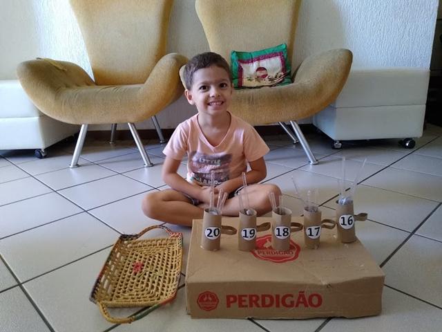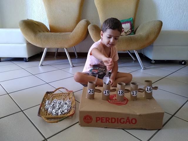 O objetivo da atividade é colocar as colheres de plástico dentro de uma xícara de acordo com o número correspondente.