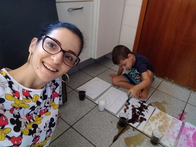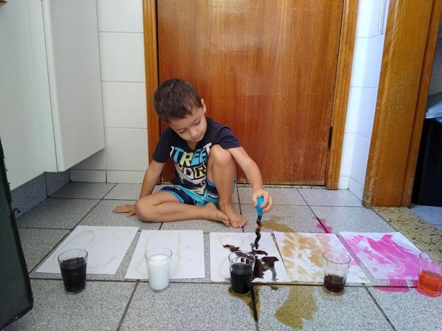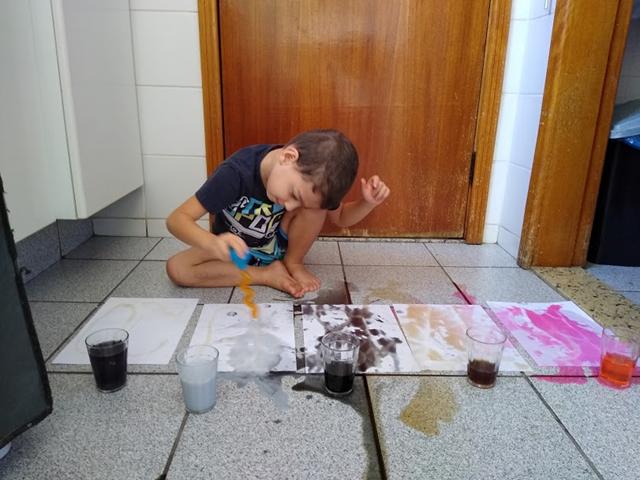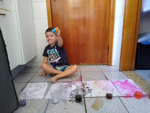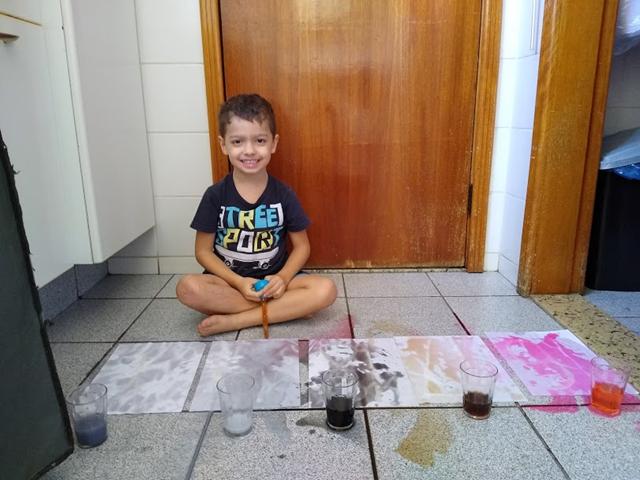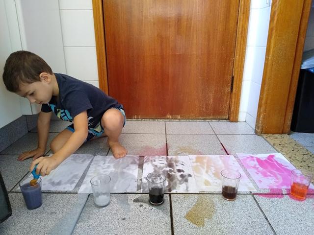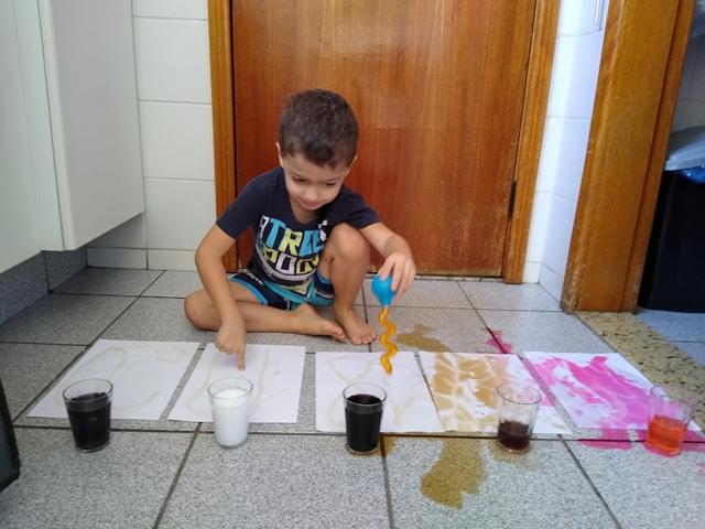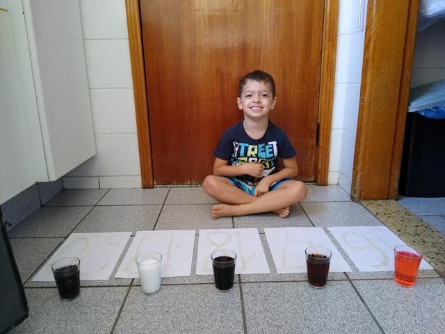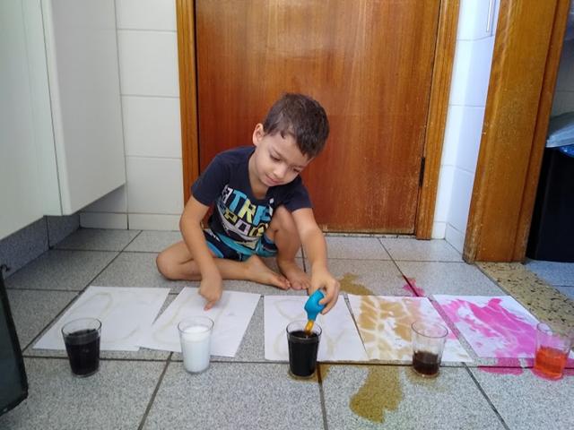 Para esta atividade usamos: cola, açúcar, papel A4, corante alimentício e conta-gotas.