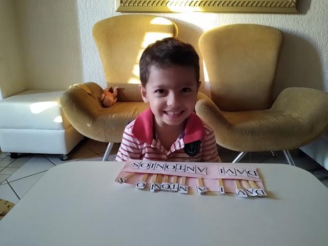Foram misturadas várias letrinhas escritas em palito de picolé e Davi Antonios tinha que formar seu nome com o auxílio da plaquinha. Davi Antonios gostou bastante! #maeemdia #brincarjunto #tempojunto #maternidadereal #maternidadeativaeconsciente #educandocomamor #DaviAntonioscom3anose11meses