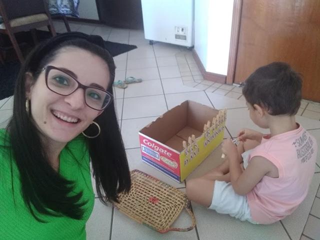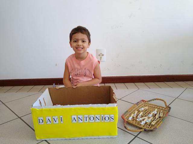 Eu fiz as letras em uma folha, recortei e colei na caixa de papelão, depois fiz a mesma letra e recortei, e colei essas letras nos prendedores.
