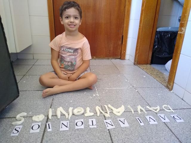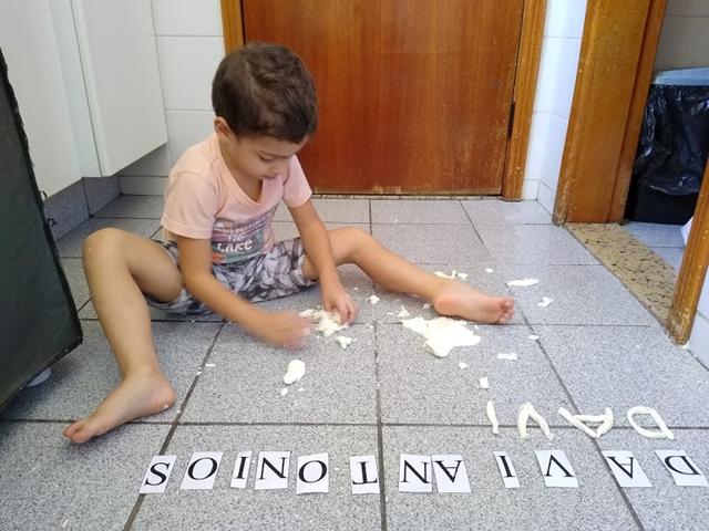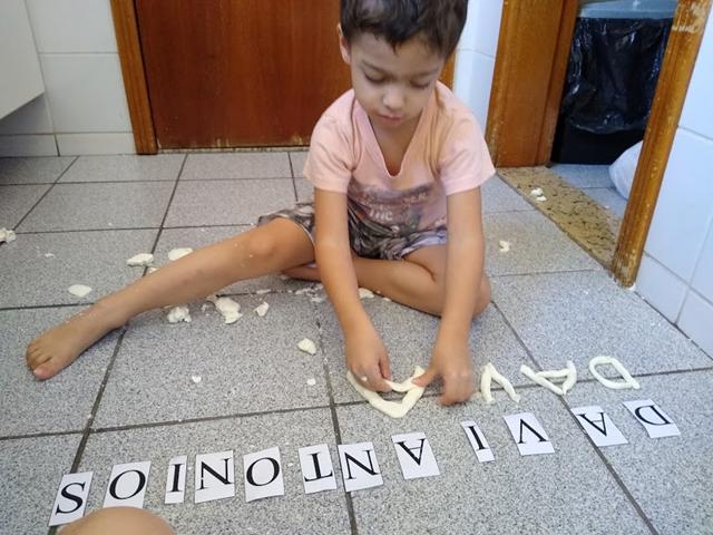 “A escrita do nome próprio é uma importante conquista para a criança, pois a partir desta referência, ela pode pensar mais sobre o funcionamento deste processo. Um dos recursos é a utilização da massa de modelar. Com a modelagem das letras levamos à reflexão sobre quantidades de letras, variedades, posições e ordens, além de servir de referência para unir as hipóteses das crianças à realidade convencional da escrita.”