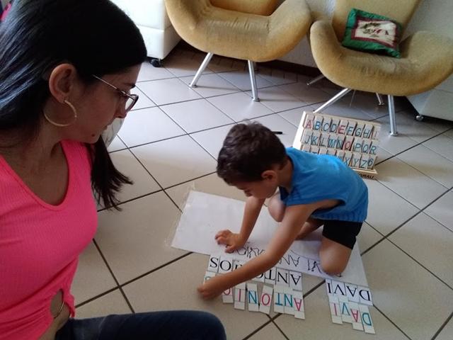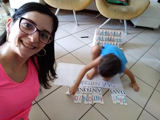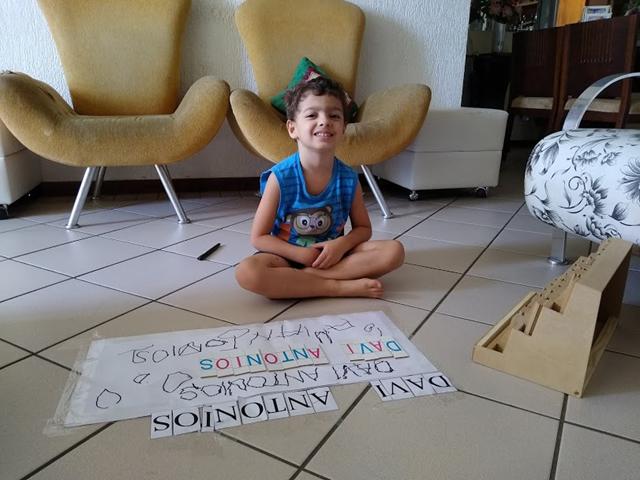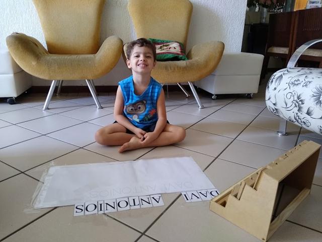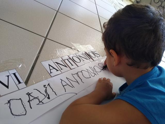 Pedi para o Davi Antonios identificar as letras do nome, escrever o nome com letras pontilhadas, fazer o pareamento e depois pedi para ele tentar escrever (fui dando as dicas dos movimentos de cada letra).