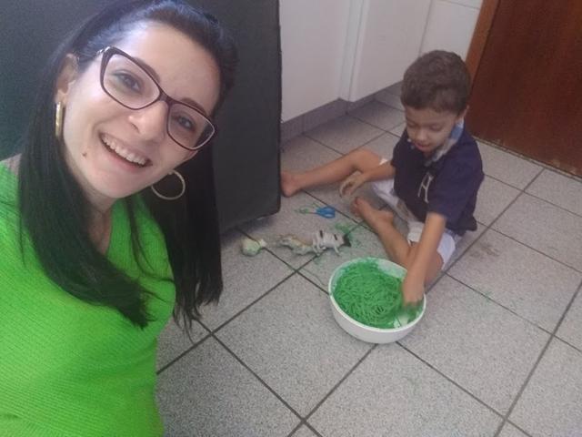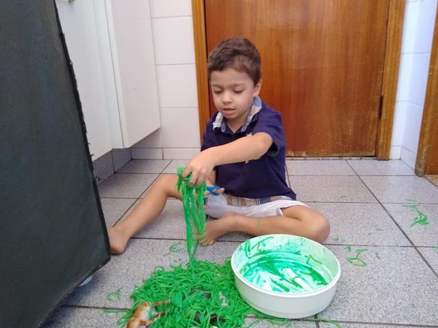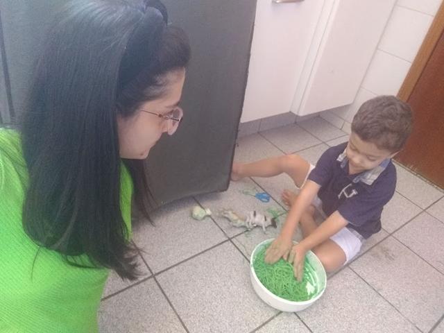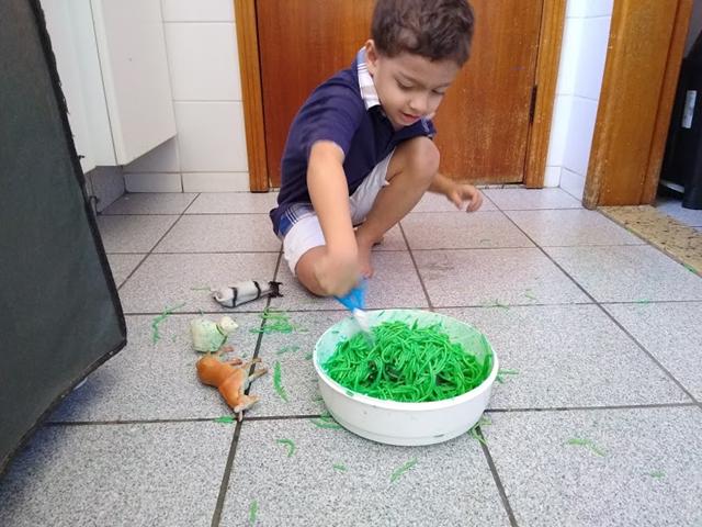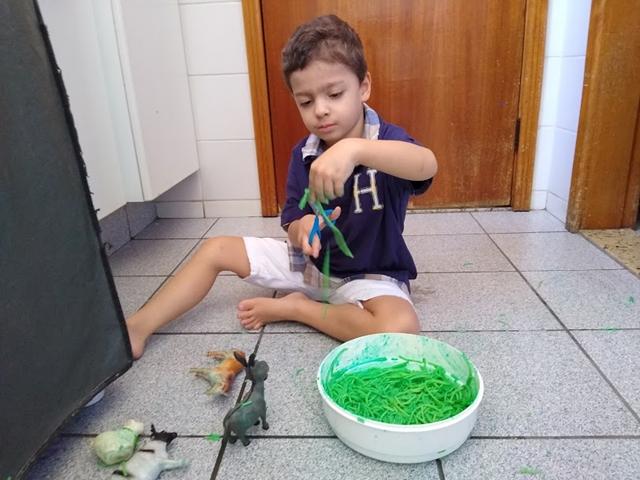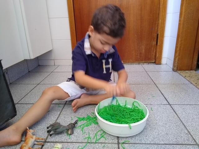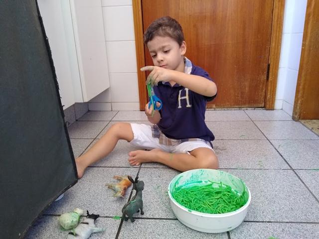 Para incentivar e aprimorar o manuseio da tesoura, fiz esse macarrão colorido para o Davi Antonios cortar. Escondi alguns animais e disse que eles estavam perdidos porque o mato estava muito grande. Ofereci uma tesoura para ele resolver o problema. Davi Antonios explorou a textura, manuseou, cortou, apertou, passou no corpo, jogou no chão e pisou experimentando diferente resultado com o macarrão cozido.