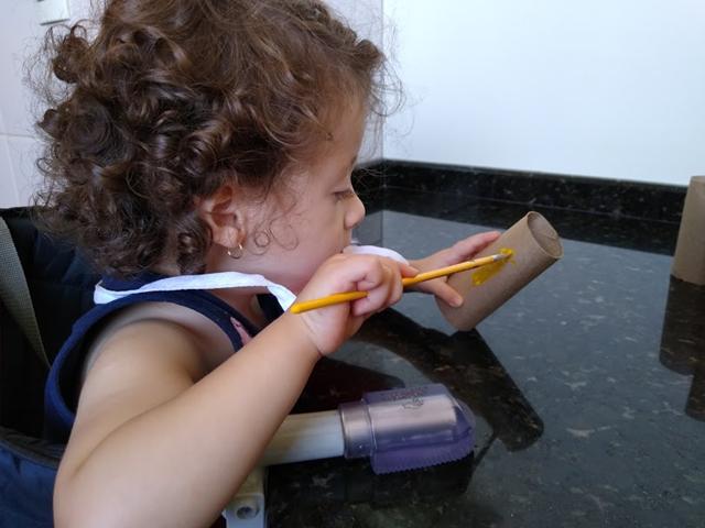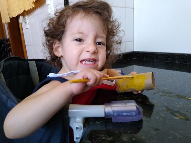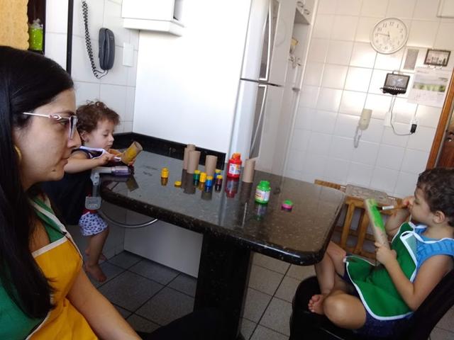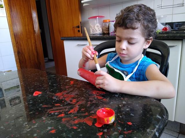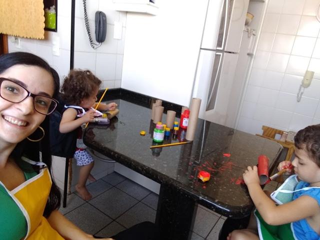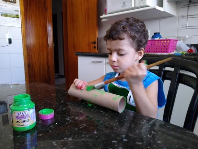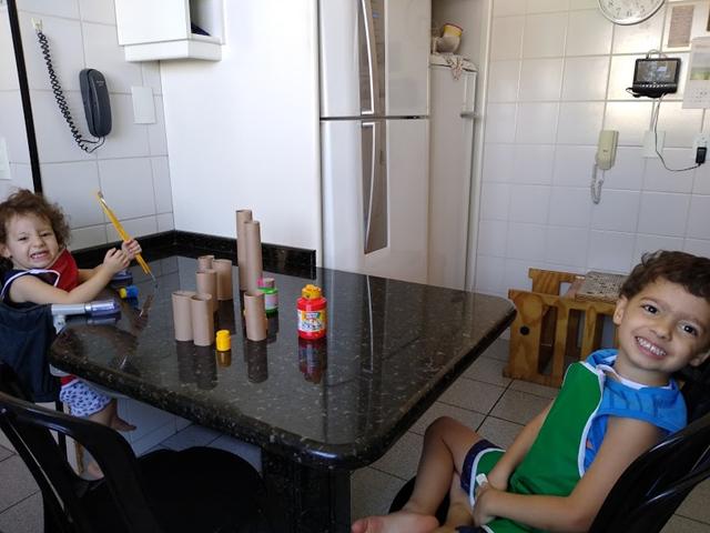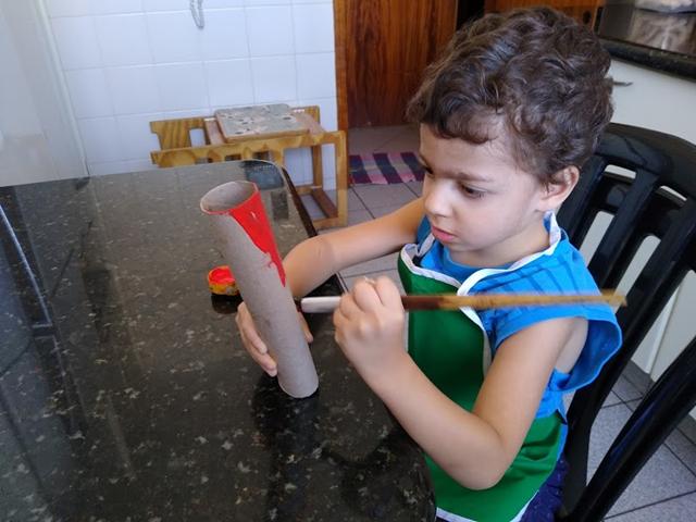 Davi Antonios e a Helena pintaram os rolos com diferentes cores de tinta guache.