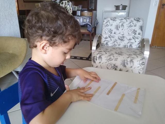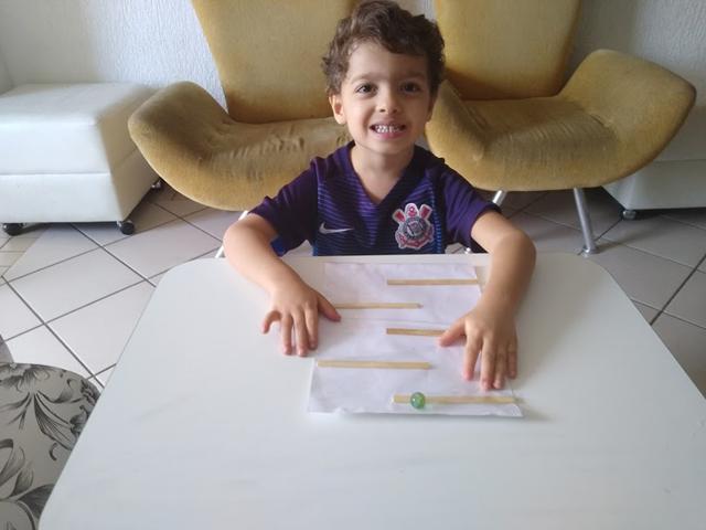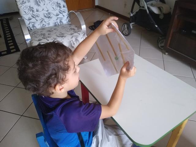 Atividade de hoje: LABIRINTO DE PALITO DE PICOLÉ. Materiais: Papel, palito de picolé, saco plástico adesivado e a bolinha de gude. O objetivo é fazer a bolinha percorrer todo o caminho do labirinto. Este brinquedo desenvolve a coordenação olho-mão, a concentração e a capacidade de solucionar problemas. Davi gostou bastante. #maeemdia #brincarjunto #tempojunto #maternidadereal #maternidadeativaeconsciente #educandocomamor #DaviAntonioscom3anose11meses