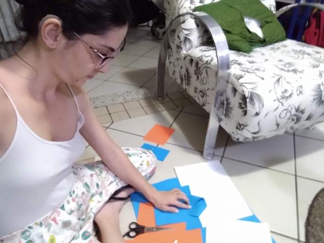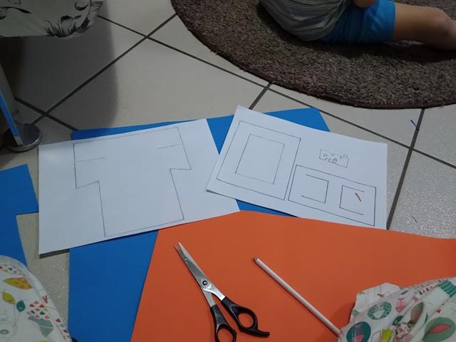 Materiais necessários: Papel EVA azul e laranja, tesoura, cola quente, lápis, estilete, botão azul e uma foto 10X15.