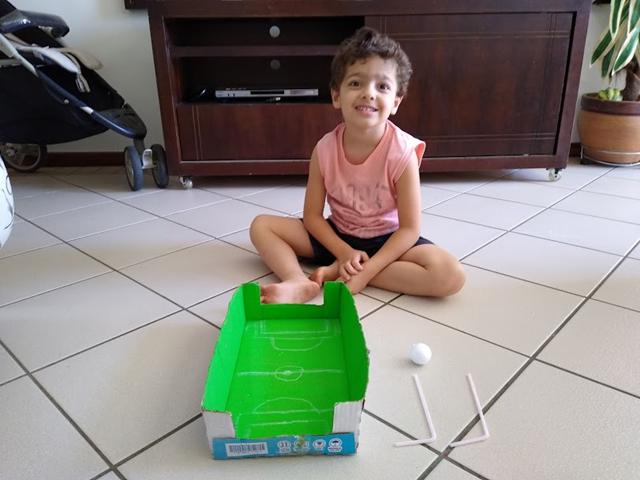 Materiais: Caixa de papelão, tinta guache verde, giz de cera branco, pincel, canudinhos e a bolinha de isopor para representar a bola.