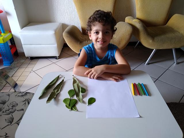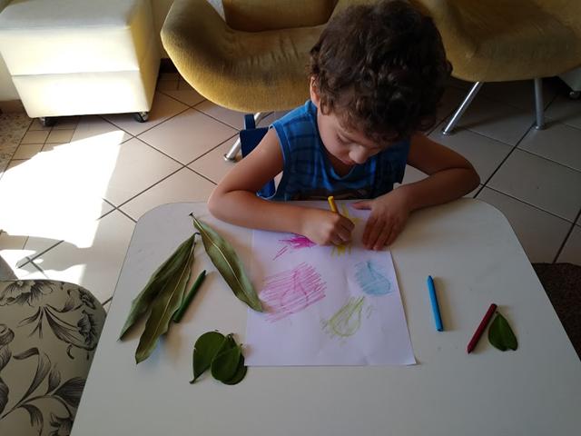 Como fazer decalque de folhas: Coloque o pedaço de papel em cima de algumas folhas. Esfregue o giz de cera para frente e para trás para marcar as texturas das folhas. Davi gostou. #maeemdia #brincarjunto #tempojunto #maternidadereal #maternidadeativaeconsciente #educandocomamor #DaviAntonioscom4anos