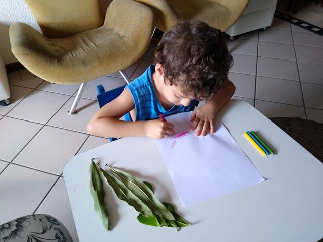 Materiais: papel para desenhar, folhas de plantas e giz de cera ou lápis de cor.