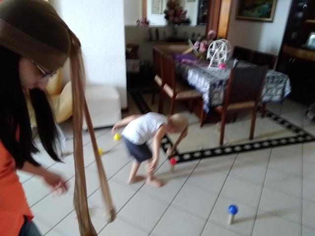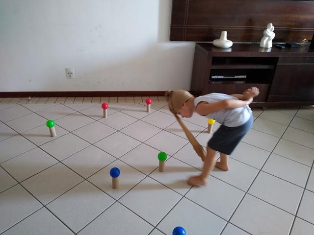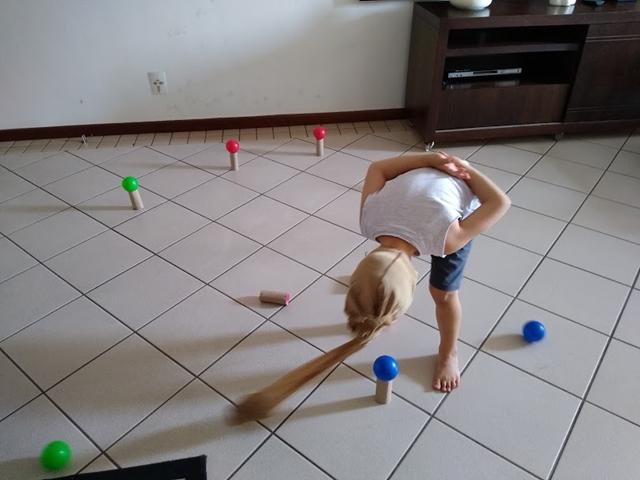 O objetivo da atividade é tirar as bolas do rolo de papel higiênico com a cabeça.