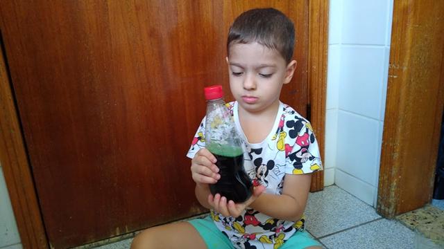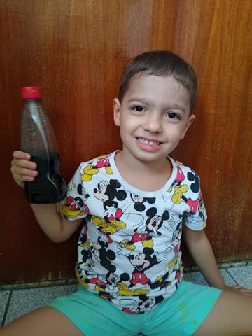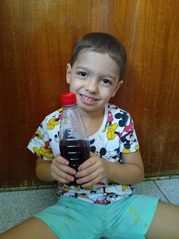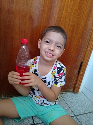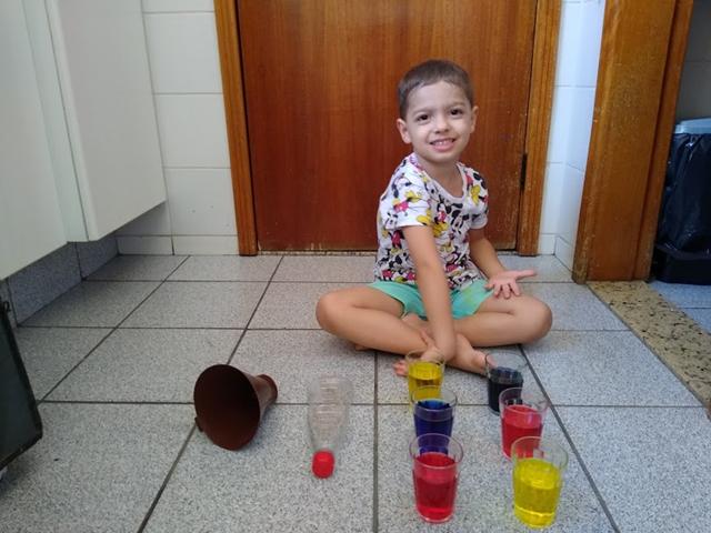 Davi Antonios me pediu para brincar com a embalagem de ketchup, sendo assim, aproveitei o interesse dele e preparei a brincadeira com as cores primárias e eles formaram as cores secundárias.