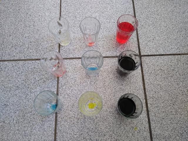 Materiais: Embalagem de Ketchup, Coador de café, copos de vidro e corante alimentício.