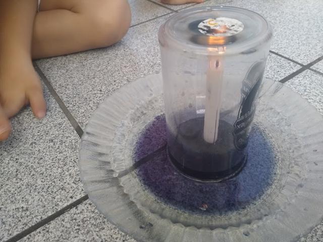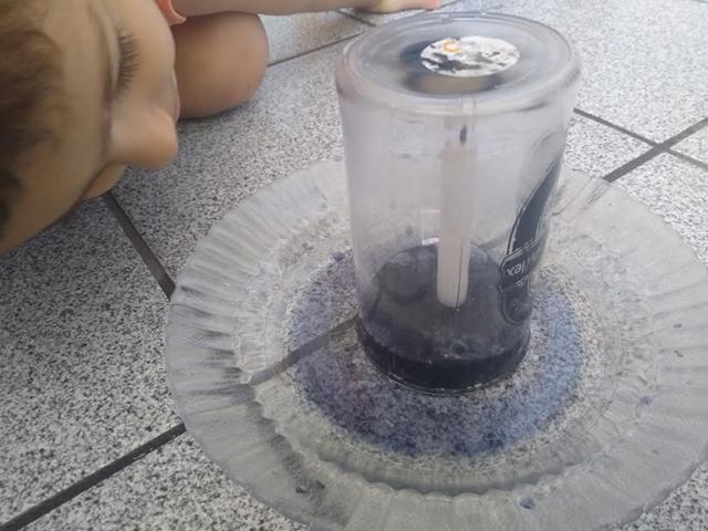 Experimento: Para montar o experimento você deve primeiramente colar a vela no centro do prato e depositar a água com corante no fundo do prato. Depois, basta acender a vela e colocar o copo com a boca pra baixo, deixando a vela dentro do recipiente.