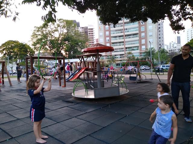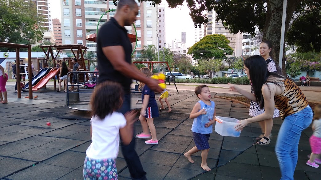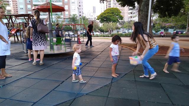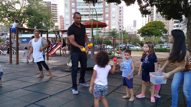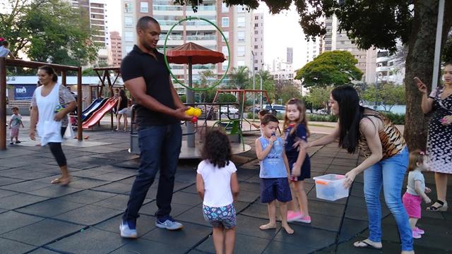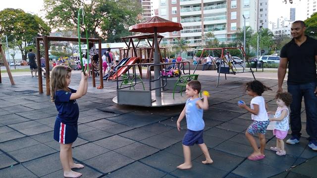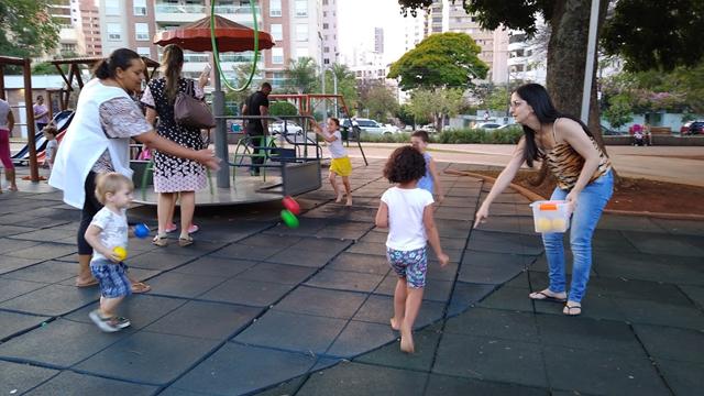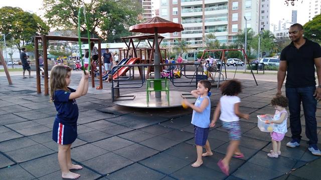 No parque, a proposta desta brincadeira: amarrei um bambolê com barbante numa árvore e as crianças podiam jogar as bolinhas por dentro do círculo.
