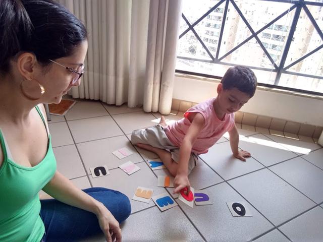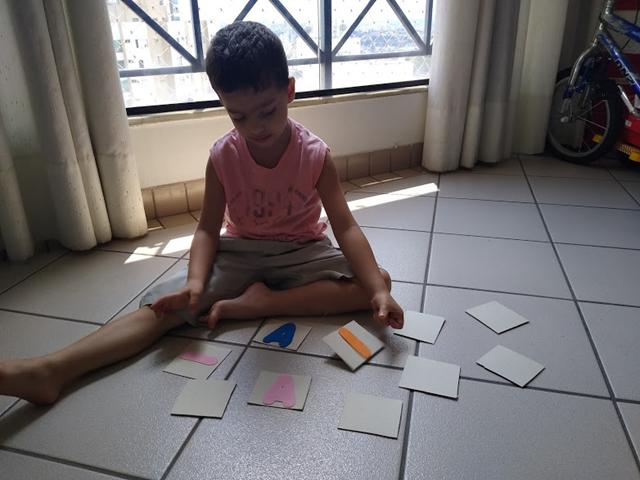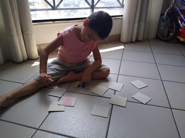 Primeiro a mamãe apresentou as vogais uma a uma, depois brincamos de jogo da Memória.