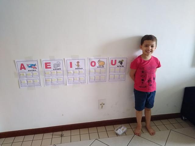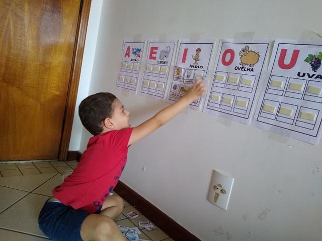 A criança deve identificar uma gravura que comece com essa vogal, pegar e colocar em cima da vogal correspondente em sua cartela.