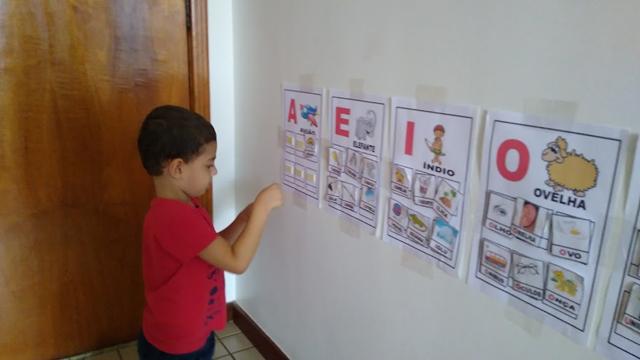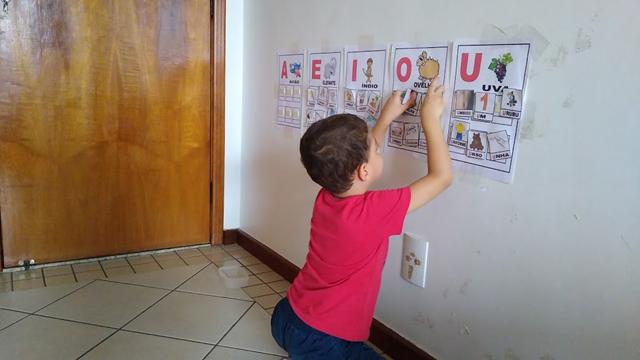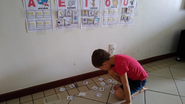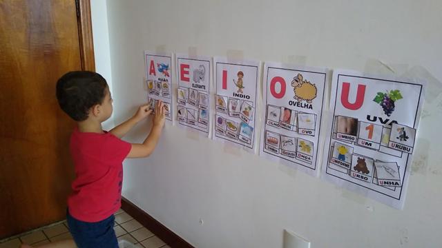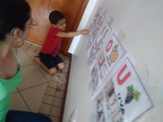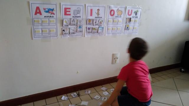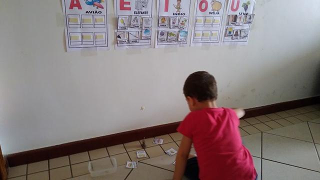 As cartelas coladas na parede com fita adesiva e as fichinhas com figuras que iniciam com vogais ficam espalhadas no chão com o desenho virado para cima para que a criança visualize.