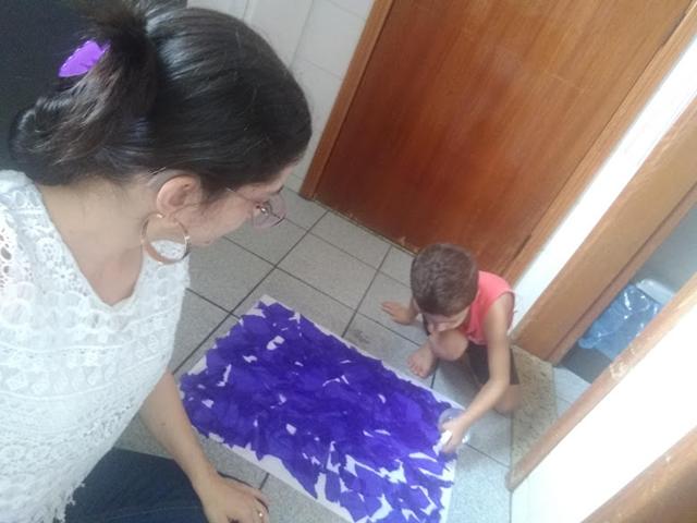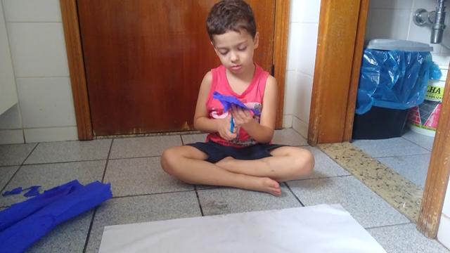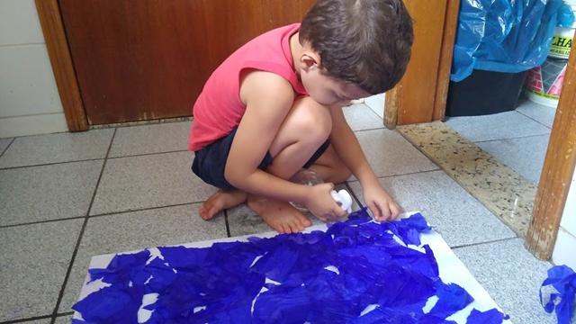 Em uma cartolina branca, Davi Antonios espalhou pedacinhos (feito por ele) de crepom colorido.