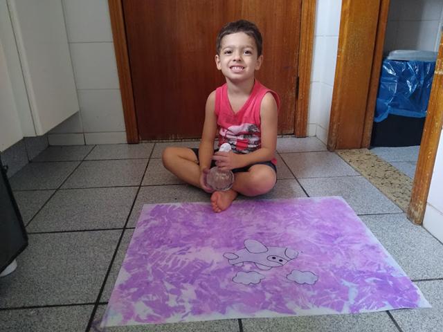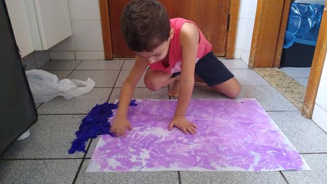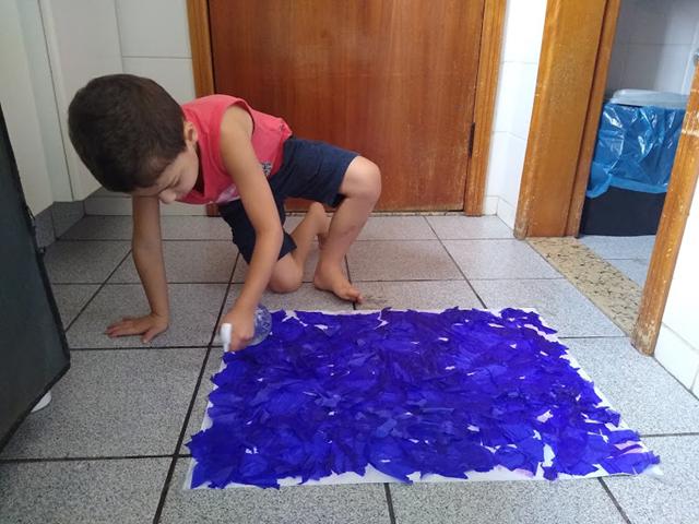 Em seguida, borrifou a atividade, umedecendo o papel crepom de forma que sua cor transpusesse para a cartolina.