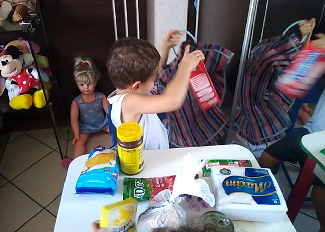 O quarto se transformou em um supermercado. A mesa estava colocada com produtos alimentícios, bebidas, produtos de higiene e limpeza e brinquedinhos. Havia um caixa e um carrinho de bebê. Davi Antonios se divertiu muito, enchendo as suas sacolinhas com diferentes produtos. A brincadeira envolveu também o manuseio do dinheiro. Sem dúvida, foi um momento de muita diversão e aprendizado! #maeemdia #brincarjunto #tempojunto #maternidadereal #maternidadeativaeconsciente #educandocomamor #DaviAntonioscom4anose2meses #Helenacom2anos